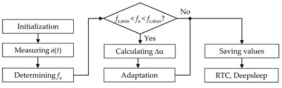 Figure 7 shows the algorithm used for the automatic adaptation in our harvesting system. After a deep-sleep period, the MCU wakes up and runs some initializations. Then, the sensor measures the acceleration and transmits the data to the MCU, which then determines the dominant vibration frequency with the method presented in Section 2.4. This takes about . If is inside the adaptation range , the MCU calculates the required angle change and the motor steps based on the actual and the required magnet angles. Subsequently, the MCU initializes the stepper motor driver and the adaptation is performed in less than 100 ms. Before setting the real time clock (RTC) for a wakeup after 30 s and going into deep sleep, important operation values required for the code are saved in the RTC backup register.
