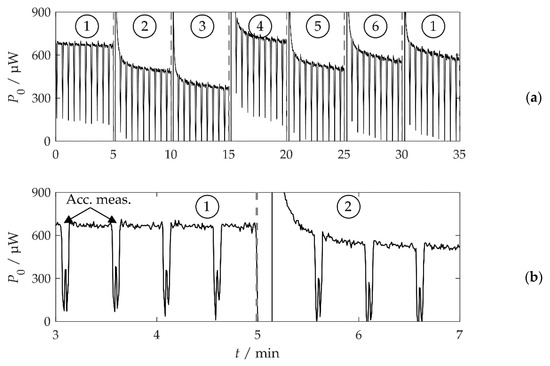 At and τ = 2 min, the voltage dropped below the threshold voltage (below , the MCU is not supplied anymore) before the end of the sequence. At and τ = 10 min, reached the upper limit before the end of the sequence. In both cases, it was therefore not possible to provide reliable averages.