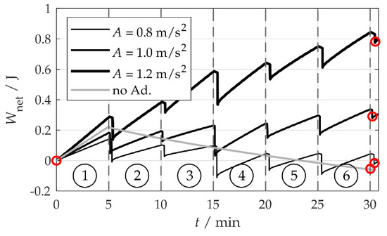 The net harvested energy is shown for different amplitudes A in Figure 9. was calculated from the capacitor energy according to . Higher acceleration amplitudes A increased the energy harvest during a full sequence, owing to the higher harvested power. Since the adaptation energy did not depend on A and was identical for all the curves shown, the net harvested energy also increased with A. and were read out by comparing the energy value at the start of the first time interval () of the first sequence run (which, here, is always ) to the starting value of the first time interval of the second sequence run. This is illustrated by red circles in Figure 9.