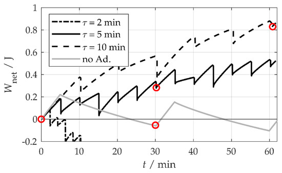 The tests were also carried out for other stationarity durations τ. Figure 10 shows the net energy harvest at for τ = 2, 5 and 10 min and, for comparison’s sake, for τ = 5 min without adaptation. At τ = 10 min, the sequence duration was 60 min, so two sequences for τ = 5 min were recorded for comparison. Thus, with a similar harvested power in all experiments, it can be seen that, in more dynamic environments with a smaller τ, the energy cost for regular adaptation increases and, consequently, and decrease. The specific results can be found in Table 1.