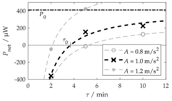 Net power Pnet depending on the stationarity duration (length of the time interval between two subsequent ambient vibration frequency changes) τ. The dots mark the values from Table 1, the dashed lines are fit functions according to Equation (7). The value of the harvested power P0 for A = 1.0 m/s² is the fit function result. It can also be interpreted as the limit value of Pnet for τ → ∞.