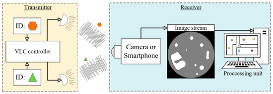 The general architecture of localization systems using VLC and camera is shown in Figure 1. The beacons are LEDs, which transmit their identity using VLC. Usually, several such beacons are deployed in known positions. The moving camera (which can be, for example, an embedded camera of a smart phone or an industrial camera deployed on top of an autonomous vehicle) creates an image stream, which is used to detect and identify beacons. Based on the detected beacon positions on the image, and the known locations of the beacons, the processing unit estimates the location of the camera.