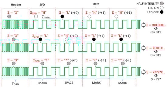 where S is the camera exposure time. When (3) holds, then the camera senses that the signal level is either high (H) or low (L), while with (4), the sensed signal level X has approximately half intensity. Notice that this is true for the ideal case, but in practice, it was found that the level of X approaches the level of H, as the communication distance increases [9]. This makes decoding more difficult and limits the maximum communication distance of UPSOOK.