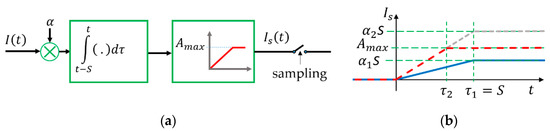 An important implication of (7) is the following: The detected light intensity is not the sampled incoming light intensity, but rather its integral over a time period of . Thus, if the input signal is a step function then, according to (7), will be a ramp signal with slope of . If there is no saturation, then the length of the rising edge is , as shown in Figure 3b (blue line). If the sensor is saturated, then the length of the ramp will be shorter, as shown in Figure 3b by the dashed red line. In this case, the length of the rising edge is .
