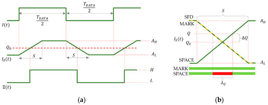 If is a rectangular signal with duty cycle of 50% and there is no saturation, then, according to (5), is a symmetric trapezoid signal with rising and falling times equal to , as shown in Figure 4a. Notice that the symbol coded by signal can be reconstructed from by using the ideal threshold