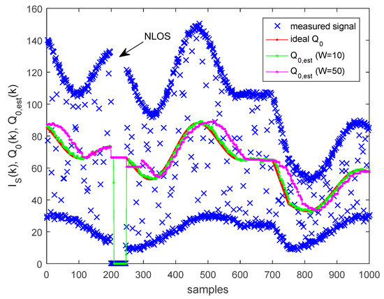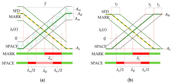 If the data symbol is MARK and no other disturbances are present, then the sample of the SFD and the sample of the data symbol will be the same (see the yellow and dashed green lines in Figure 4b); in this case, the value of Q has no effect on the decoding, i.e., for MARK symbols there is no unsafe interval. Since in a message, both MARK and SPACE symbols may be present, in the worst case, (9) provides the width of the unsafe interval.