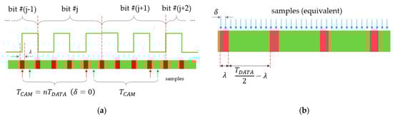 where can be considered as the error of the camera’s sampling interval when the transmission frequency is accurate. If is not zero, the phase of the sampling instants is shifted at each sample, the effect of which is shown in Figure 6a for the kth data bit. Notice that during decoding each sample is compared to the SFD, according to (5). Thus, the reference is the SFD sample, and each of the successive sampling times of the data bits are shifted by , the total delay being at the kth data bit, as shown in Figure 6a. Thus, compared to the reference SFD, the first bit is sampled later than ideal; the delay of the second bit is , etc., generally the th bit is sampled later. Thus, the unsafe interval for the th bit, due to frequency error, for both the SPACE and MARK symbols is the following: