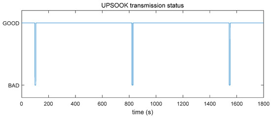 First, we will highlight a possible weakness of current undersampled on-off-keying (OOK) protocols in applications where guaranteed response time is required with high reliability. We will demonstrate that these protocols are very likely to fail periodically, and also analyze the reason behind this phenomenon: The failure is primarily due to the combined effect of the integral sampling of the camera and the slight frequency slip present between the transmitter’s and the receiver’s clocks. The presence of noise, jitter, and sensor saturation all increase the probability of the failure. We will use the Undersampled Phase Shift ON-OFF Keying (UPSOOK) protocol [9] for demonstration, since its elements will be utilized later in the proposed protocol. Notice that the discussed effect is not specific to UPSOOK, but is can be observed in other undersampled protocols as well [14].