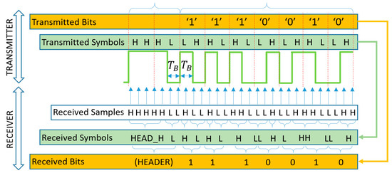 To provide flicker-free operation for ordinary cameras (where the sampling rate can be as low as 30 Hz), special undersampled coding schemes must be used. In the literature, several undersampled modulation schemes have been proposed. Undersampled Frequency Shift ON-OFF Keying (UFSOOK) [8] used frequency modulation with two specially designed frequencies for data coding, and a third frequency for header. The header frequency is high, so the camera senses it as half-intensity signal. Each bit is decoded using two consecutive samples: The coding frequencies are chosen that in case of bit 1 the two samples are identical, while in the case of bit 0, they are different. UPSOOK [9] uses phase modulation; here, one bit is decoded using one sample (plus the header). In UPSOOK, only one frequency is used for data coding and the bits are coded with 0 or 180° of phase shift in the transmitted signal. The detailed operation will be described in Section 2.3. The phase modulation was combined with amplitude modulation in [10], thus one transmitted symbol can decode multiple bits, providing higher bitrate. The amplitude modulation can be replaced with high-frequency pulse-width modulation, allowing simpler transmitter hardware [11].