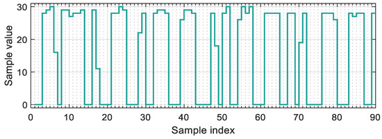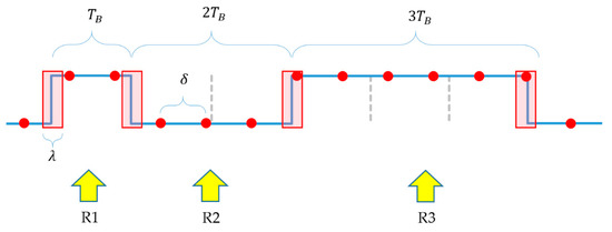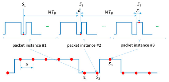 The illustration of Figure 4b shows multiple signal segments of around signal changes, so that the shown signal segments are apart, where is integer. If (1) holds, then all rising edges and all falling edges are precisely aligned, as shown in Figure 4b. The horizontal axis represents possible sampling instants and at the same time successive sampling instants time later. Using the figure, the values of the samples can be determined, given the sampling instant and the threshold.