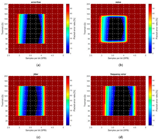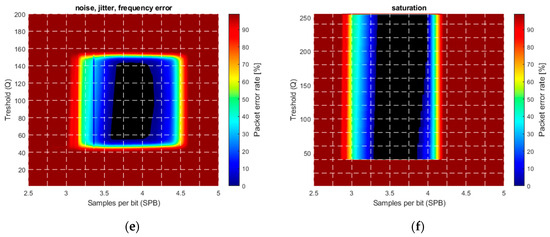 The frequency error was modelled as a constant bias in the camera frequency: The camera frequency was set to . The effect is visible in Figure 13d, where the original error-free region is shifted to the right. The explanation is the following: RUPSOOK uses a constant frequency difference between the camera and the transmitter, according to (28) and (29). This frequency difference is modified by the constant frequency error of the camera, thus the designed SPB value is different from the nominal value, thus the error-free region is shifted. If the sampling of camera is faster/slower than expected, then the real SPB is higher/lower than the nominal, causing shift of the error-free region to the left/right. The theoretical relationship between the nominal SPB, the real SPB’, and the frequency error is the following: