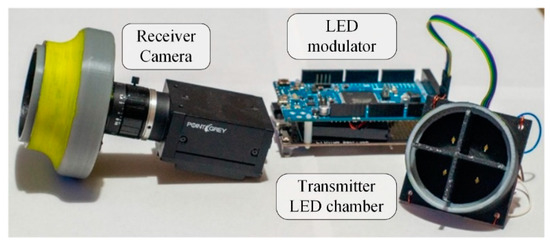 - Roberts, R.D. A MIMO protocol for camera communications (CamCom) using Undersampled Frequency Shift ON-OFF Keying (UFSOOK). In Proceedings of the 2013 IEEE Globecom Workshops (GC Wkshps), Atlanta, GA, USA, 9–13 December 2013; pp. 1052–1057. [Google Scholar] [CrossRef]