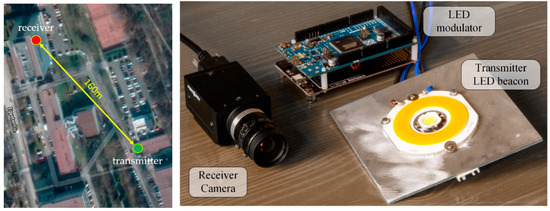 During the tests, two measurement setups were utilized: A well-controlled laboratory environment and a long-distance outdoor setup. In the laboratory setup, the camera and the low-power transmitters were built into an enclosure blocking external light, where the minimum and maximum light intensity, along with the noise level, can be controlled. The photo of the equipment is shown in Figure 14. In the long-distance setup, power LEDs were used, as transmitters. The map of the premises and the photo of the equipment are shown in Figure 15.