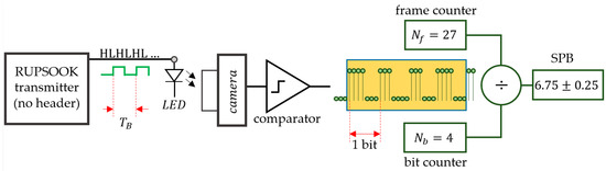 The transmitter is the RUPSOOK transmitter under test, but during the SPB measurement, the packets do not contain header and the same symbols (e.g., MARK symbols) are transmitted, resulting in a continuous alternating sequence of HLHLHL. The received samples are binarized by a comparator. The measurement is performed using two counters: One counter contains the number of received bits , while the other counts the number of received frames (or samples) . After each received full bit, the ratio of the samples and bits is calculated, providing an estimate for the SPB value: