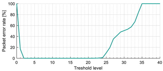 The camera frequency was set to , the simulated aperture time was , and the received signal amplitude was set between 40 and 160. The threshold was varied from 0 to 255, and the transmitter frequency was tuned to provide samples per bit between 2.5 and 5. In each simulation, the same transmission sequence with 200 packets was used and the packet error rate (PER) was calculated as follows: