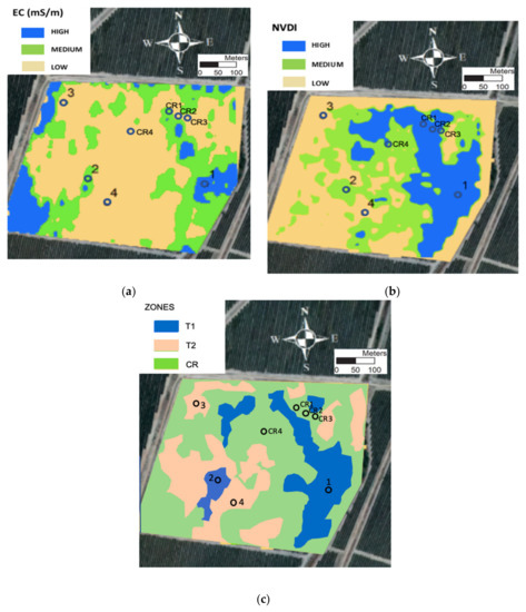 Figure 1a shows the soil ECa map and Figure 1b the NDVI map. ECa is related to different soil characteristics that directly or indirectly influence the availability of water for cultivation. The map was made in August when the water content was mostly from irrigation. These served as the basis for determining the control points in the study plot. As seen in Figure 1a, the values classified as low, medium and high (because the ECa values may change with different water contents in the plot) allowed identification of areas with different ECa values in the plot. The highest ECa values were found in the southwestern, northwestern and eastern areas of the experimental field, corresponding to a higher water retention capacity. Soil texture was one of variables considered in the geostatistical analysis for identifying the management zones in the plot [40]. Analysis of the satellite image (Figure 1b) allowed identification of the areas with highest and lowest canopy crop development. The NDVI showed the highest values to be in the northern and central areas of the field. These intra-field ECa and vigor differences are due to a complex interaction of biological, agronomic, edaphic, anthropogenic, topographic and climatic factors [32].
