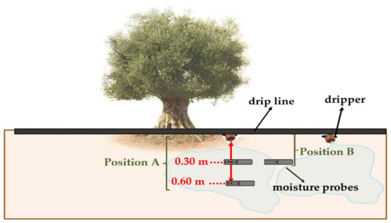 - Sensors installed in the field: to monitor the soil moisture, 10 HS capacitive moisture sensors (Decagon Devices Inc., Pullman, WA, USA) were installed at different positions (position A and position B) (Figure 2) in the different control points selected (CR1, CR2, CR3 and CR4). Two drippers were monitored at each control point. Four moisture sensors were placed under each dripper in the position A, two at a depth of 0.30 m and the others at a depth of 0.60 m. In addition, one measure sensor was situated between the two drippers in the position B at a depth of 0.30 m (Figure 2). These 5 moisture sensors were installed in each of the control points (CR1, CR2 and CR3) in 2016, making a total of 15 sensors. In 2017, the number of soil moisture sensors was increased from 15 to 20, as a new control point was added (CR4). When an error was detected in any of the sensors that had been installed, that sensor was automatically replaced with another in the same position.