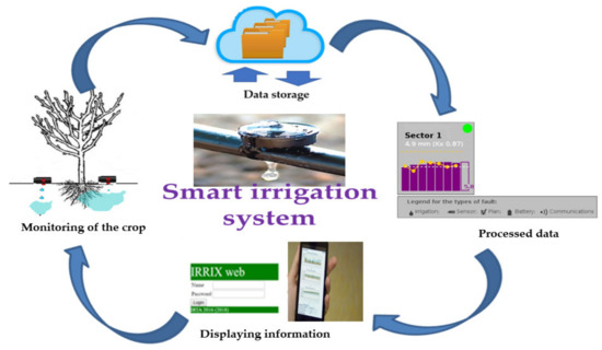 Figure 3. Tasks carried out by IRRIX. - Analysis of all data and calculation of irrigation water volumes. Once a day, IRRIX analyses the set of data to determine the irrigation dose using the information provided by the moisture sensors. To achieve this, this tool integrates an algorithm which combines a WB-based estimation of crop water needs (feed-forward control) with readjustment based on sensor readings (feedback control). [25,28,44]