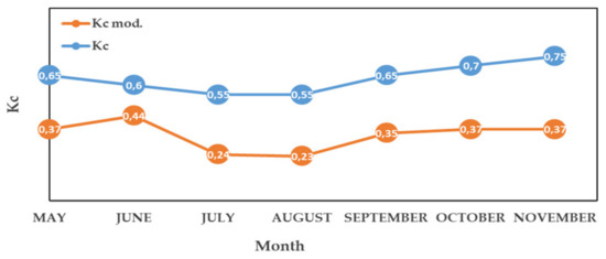 Crop coefficient (Kc) values according to the physiological state of the olive grove. Kc was adjusted to the crop conditions of Extremadura and was calculated with the Orgaz et al. [47] method using the 10-year average, and Kc mod. was adapted to the deficit irrigation strategy.
