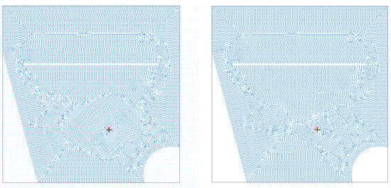 Now, we invoke either Equations (18)–(20) or (37) and note that the actual faults are expected such that the objective function decreases. Thus, the location of the faults is labeled by negative peaks of the topological derivative.