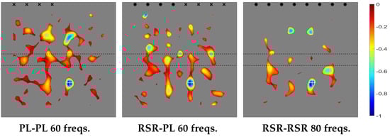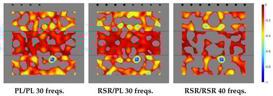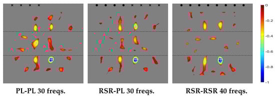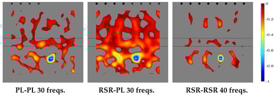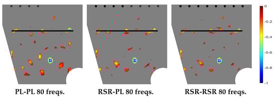 The topological derivative for the present case is given in Figure 8, where it can be seen that the method performs well and shows similar trends as in the previous cases in connection with the emitters/receivers configurations. However, the number of required frequencies is now larger. This is because the defect is located in the thick part of the plate, where according to our previous comment on Figure 4, the contrast in the topological derivative is smaller.