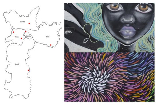 Left: red dots indicate the areas within the five zones of the city of São Paulo where the photos of the graffiti were taken. In total, 228 photos were analyzed in the study: 26 from the north, 59 from the south, 44 from the east, 44 from the west, and 55 from the center. The areas were chosen to represent the diversity of styles and selected under the advice of local recognized graffiti artists. Right: two examples of graffiti in our sample.