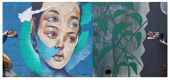 The camera was a Nikon D7000 with a resolution of 4928 × 3264 pixels, and the optical conditions were such that the average resolution of the system was about 0.5 mm per pixel. An X-Rite Macbeth ColorChecker Classic with 24 samples was included in the field of view of each photo as shown in Figure 2. The ColorChecker was used for calibration purposes, for both colorimetric calibration and spatial scaling. For colorimetric calibration, the spectral irradiance on the color chart was measured immediately before taking the photo with a portable spectro-colorimeter Everfine SPIC-200, in the spectral range from 380 to 760 nm.