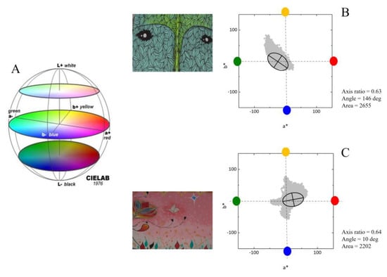 The corrected colors of each pixel were represented in the CIELAB color space [37,38]. We selected this color space because it is a perceptual space, i.e., it represents perceptions rather than physical variables, and because it is reasonably uniform in the sense that has the same metric across all space. Figure 3A illustrates the three dimensions of this color space: L*, lightness; a*, red–green dimension; and b*, yellow–blue dimension. Figure 3B,C illustrates the representation of the color gamut of two graffiti represented in the (a*, b*) plane of the color space. In this work we were not concerned with lightness, the L* component, but were solely concerned with the chromatic dimensions defined in the plane (a*, b*).