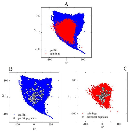 Figure 5B shows the colors of graffiti paints, and Figure 5C shows the colors of historical pigments. These colors were computed assuming standard illuminant D65 (as mentioned above, the colors were computed assuming the illuminants measures at the time of image acquisition of graffiti were similar because the CIELAB color space is lowly sensitive to changes in illumination, just like the human eye). Graffiti pigments can be more saturated than historical pigments, explaining the differences in gamut sizes. They are made with contemporary artificial pigments that can be more saturated than those used in our sample of paintings, which ends in the mid 20th century. The palette of contemporary pigments includes new synthetic pigments which can be more permanent and saturated [43]; therefore, if we were analyzing contemporary paintings the gamut sizes obtained would certainly be larger.
