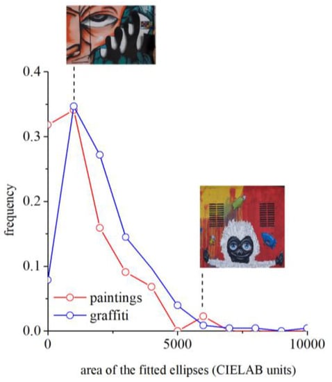 To look at the gamut of individual graffiti and paintings, the size of the color gamuts, i.e., the area occupied by the colors in the color space, was also computed. Figure 6 represents the distribution of these areas. These areas are a measure of the number of colors that can be seen in each graffiti or painting at viewing distances close to the resolution of the human eye, e.g., of about 1.5 m for the graffiti and about 1.8 m for paintings (see Section 2). For illustration purposes, two examples are shown for the graffiti, one with a small area showing a reduced number of colors and one with a large area showing a considerably greater diversity of colors. The average areas are 6.2 × 103 for graffiti and 3.4 × 103 for paintings. Thus, graffiti represent considerably more colors, which translate into the perception of greater chromatic richness.