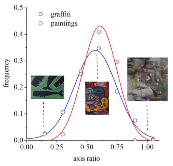 The variability of colors across the gamut was quantified by the axis aligned along the principal directions of the colors of the gamut. The axes sizes were proportional to the standard deviation. The axis ratio between minor and major axes gives information about how elongated the gamut is. Thus, values close to one represent gamuts uniformly spread in the color space, whereas values close to zero represent gamuts elongated in a specific direction. Figure 7 shows the distributions of axis ratios for graffiti and paintings. Circles represent data points, and lines represent Gaussian fits to the data. Both samples can be well-described by Gaussians that have maxima in similar values, 0.57 for graffiti and 0.61 for paintings. Thus, graffiti and paintings have gamuts with similar elongations, which translates into similar perceptual balance across perpendicular directions in color space.