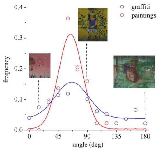 The orientation of the gamut in the color space was characterized by the angle of the major axis with the positive a* axis (see Figure 3 for examples). Figure 8 shows the distributions of these angles for graffiti and paintings. This quantity captures the type of colors that shows greater variability. Circles represent data points and lines represent Gaussian fits to the data. The maximum of the Gaussian distribution for graffiti is 66° and for paintings is 64°. The greater variability is in a yellow–blue direction of color space both for graffiti and paintings. For illustration purposes, three examples are shown for the graffiti. The spread of the distribution of angles for graffiti is wider than for paintings, suggesting more freedom in the use of colors.