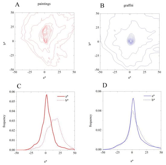 The frequency of occurrence of each color was computed to compare the color distribution between paintings and graffiti. For this analysis, the bin size was 1 unit in CIELAB, i.e., colors are the same if they are less than 1 unit apart. Figure 9 shows the results of this analysis: panels A and B show the contour lines of the frequency of occurrence of the colors in paintings and graffiti, respectively; panels C and D represent the a* and b* histograms for paintings and graffiti, respectively. These data show that the colors in graffiti are used more isotopically than in paintings, i.e., the color distribution of graffiti is consistent with the fact that the corresponding gamut orientations are more spread out (Figure 9B,D), as also shown in Figure 8, while for paintings they are more pronounced on the b* axis (Figure 9A,C).