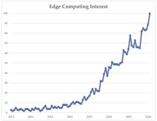Both search engines and libraries were used to write the review. As reported on Google Trends [], in these years there has been an increase of interest from the scientific community on the topic and issues of edge computing (Figure 1) and a total of 6342 papers are reported from Scopus []. The keywords employed to obtain the papers to be analyzed was edge computing.