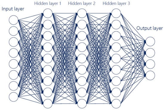 A deep learning model can be thought as a combination of weights and biases []. These parameters are varied by an optimization function (ADAM [] optimization algorithm is generally used) based on an objective function (loss function or reward function, if the learning is, respectively, supervised or reinforcement) that measures the predictive power of the model. Following a training phase, the AI algorithm identifies an underlying pattern between the data, predicting a value as a function of the inputs’ data. Depending on the training phase, we can distinguish various learning techniques: (1) Supervised learning (both inputs and outputs are provided to the algorithm), (2) unsupervised learning (only inputs are provided), and (3) reinforcement learning (an objective reinforcement function is maximized). During the inference, the inputs’ data pass through the layers and each layer performs matrix multiplications. The output of the final layer is either a number or a classification output. A deep neural network (DNN) [] (Figure 2) is an artificial neural network (ANN) with multiple layers between the input and output layers and the operations include linear or nonlinear functions. A special case of DNNs involves the usage of the matrix multiplications with convolutional filter operations, which is common in DNNs that are designed for image and video analysis. This type of models is known as convolutional neural networks (CNNs) [] and they are used when the numbers of input variables are high. The DNNs designed especially for time series prediction are called recurrent neural networks (RNNs) [], characterized by having loops in their layer connections to keep state and enable predictions on sequential inputs.