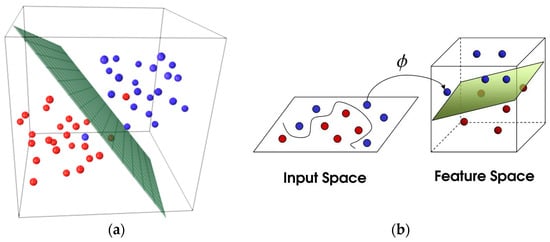 One of the most widely used ML algorithms at the embedded level is the SVM [,,,]. SVM is a supervised learning algorithm that can be used for both classification and regression problems. The algorithm discriminates between two or more classes of data by defining an optimal hyperplane that separates all classes (Figure 3a). The support vectors are the data closest to the hyperplane, which, if removed, would result in a redefinition of the hyperplane itself. For these reasons they are considered the critical elements of the dataset. Usually, the loss function used by the algorithm is the Hinge loss and the optimization function is the descending gradient technique.