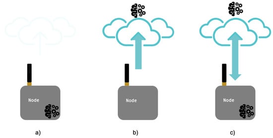 The Internet of Things (IoT) scenario [,] has gained a lot of notoriety in recent years. It encompasses an infrastructure of software and hardware that connects the physical world with the Internet. Due to the explosive growth of interest in this paradigm, the number of IoT devices has increased dramatically in recent years. It has been estimated that by 2025, more than 75 billion devices will be connected to the Internet [], leading to an economic impact on the global market. IoT devices typically have limited computing power, small memories, and could generate large amounts of data. Low-power and connected systems including mainly sensors will be used in our homes, cities, vehicles, and industries. Cloud computing might be suitable for the IoT sector growth but the delay caused by the data transfer is unacceptable for some tasks (e.g., health monitoring), in addition to possible bandwidth saturation. So, due to the greater numbers of connected devices, the only-cloud processing could become impractical and would lead to greater latency, bandwidth decrease, and privacy and reliability problems []. Hence the need to bring the calculation as locally as possible, incorporating intelligence on end devices to limit cloud traffic. This means giving a sort of “consciousness” to the devices that become able to interact also in the absence of the connection, elaborating complex behavior, and adapting to rapidly changing situations, a sort of “Internet of Conscious Things”. Unfortunately, limitations in the computational capabilities of resource-scarce devices restrict the implementation of complex machine learning (ML) algorithms on them, although several frameworks based on software agents provide reliable and effective solutions for the optimizations of different edge computing implementation [,,]. The tasks that can be delivered to the edge elements are related to low-data fusion [], while for a deeper understanding of the data (e.g., decision-making purposes) it is necessary to assign the calculation to more efficient systems. However, the transferring of raw data to cloud servers increases communication costs, causes delayed system response, and exposes private data. To address these issues, a practical solution is to consider processing data closer to its sources and transmitting to remote servers only the data needed for further cloud processing. Edge computing refers to computations being performed as close to data sources as possible, instead of remote locations.