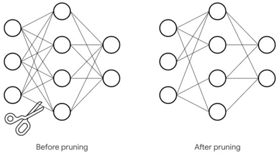 The model compression allows us to run the model on tiny devices [] and there are two main ways to reduce the network: Lower precision (fewer bits per weight) and fewer weights (pruning). Post-training quantization reduces computing power demand and energy consumption at the expense of a slight loss in accuracy. By default, the model weights are float32 type variables, which lead to two problems: Firstly, the model is very large because 4 bytes are associated at each weight, with a considerable memory requirement; secondly, the execution is remarkably slow compared to uint8 type variables. It is possible to considerably reduce the weights from 32 bits to 8 bits, obtaining a 4x reduction in the size of the NN. Note that post-quantization is a technique that is carried out after training the model, but it could be done even before training. ML libraries, such as Tensorflow [] or Keras [], give the possibility to apply quantization. As stated above, the reduction of the model size can be obtained not only with quantization, but also with pruning techniques that allow the elimination of connections that are not useful to the NN (Figure 5); this leads to a decrease of the computation request and program memory. Quantization and pruning approaches have been considered individually as well as jointly []. These two techniques are the basis of NN compression, from which further techniques have been developed. DeepIoT [] presents a pruning method for commonly used deep learning structures in IoT devices, and the pruned DNN can be immediately deployed on edge devices without modification. Loss-approximating Taylor expansion was used in [] as a gradient-based importance metric used for pruning. Anwar et al. [] selected pruning candidate by hundreds of random evaluations. Yang et al. [] selected pruning candidate weighted by energy consumption. Early pruning [] and dynamic pruning [] explored how to integrate pruning with a better retraining, and saved the retraining time. A technique that is not among those of pruning and quantization, but which has a significant value, is the knowledge distillation. This involves creating a smaller DNN that imitates the behavior of a larger one []. This is done by training the smaller DNN using the output predictions produced from the larger one and the smaller DNN approximates the function learned by the larger one.