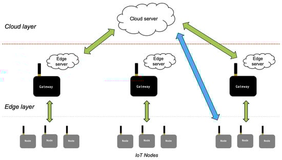 ML algorithm can be performed on edge devices and on the cloud. Entrusting the computational task to the cloud could create a latency problem. Instead, the use of powerful computational cloud resources can potentially decrease the total processing time. For example, Li et al. [] divided the DNN model into two parts: The edge server computes the initial layers (lower layers) of the DNN model after it received the input data and then the cloud computes the higher layers of the DNN. The cloud sends back the final results to the end devices after processing. In this way, the cloud helps the edge server with the heavier computations. There are also other approaches like DDNN [] (distributed deep neural networks) in which the computing is distributed across an hierarchical system, consisting of the cloud, the edge (fog), and end devices. DDNN also allows fast and localized inference using shallow portions of the NN at the edge and end devices. Due to the distributed nature, DDNNs improve the fusion of the data from network sensors, system fault tolerance, and privacy for users. Generally, a common feature for the edge approaches is that the edge server serves a limited geographical area, so the input data and, thus, their DNN outputs may be similar.