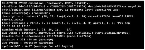Microcontrollers can be used for AI but implementing the algorithm on them is challenging. They are excellent choices in IoT applications and may run networks that are not too large for low-data fusion tasks. A good tool to facilitate the implementation of a DNN on a microcontroller is the X-CUBE-AI [], suitable only for STMicroelectronics MCUs. It is an expansion of the STM32CubeMX environment that extends the potential of the tool, allowing an automatic conversion of pretrained NNs to low-resource hardware. X-CUBE-AI also optimizes libraries by modifying layers and reducing the number of weights to make the network more “memory-friendly”.