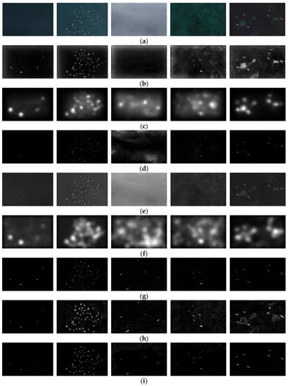 As show in Figure 1, the spatial domain saliency detection method has weak suppression ability for the sea surface background such as the sea cloud and sea waves (such as Figure 1b,c), while the frequency domain detection method has better suppression ability (such as Figure 1d,g), but the saliency object regions obtained by SR and PQFT have obvious detection incompleteness and it is not imperfect to remove cloud interference. HC can detect complete saliency objects, but it filters out little background information. The detection result of PCA is relatively poor, not only does it fail to effectively filter out the background information, but the detected saliency objects have expanded a certain number of pixels, resulting in the phenomenon of target aliasing. HFT can basically detect complete saliency objects, but it still contains certain redundant background information. Based on the classic HFT method, improved components of CIE Lab color space used in this study are more line with the human visual perception. Moreover, the adaptive scale Gaussian fuzzy model can achieve clear inspection of saliency regions of different sizes. By selecting the optimal saliency map through spatial standard deviations and contrast function, we can highlight both boundaries and their internal regions of saliency objects. As compared with HFT, the proposed method can accurately detect complete saliency objects in the presence of complex texture background information, as show in Figure 1i.