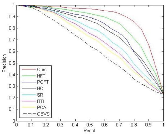 In order to evaluate the experimental results of saliency detection, we analyzed them from qualitative and quantitative aspects. In qualitative experiments, we used the Google Earth dataset to compare ITTI, GBVS, SR, HC, PCA, PQFT, HFT and our model. Some representative qualitative experiment results are shown in Figure 1. The experiments are carried out on a computer: Image resolution, 756 × 493; Image number: 60; Intel i5 3.5 GHz; RAM 16 G, GTX 1080.