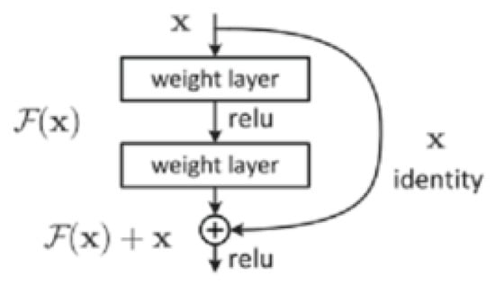 The number of CNN layers greatly affects the performance of feature extraction when the number of layers in the network reaches a certain degree. Not only is the training process more complicated, but also problems of gradient disappearance, gradient degradation and gradient explosion will occur, resulting in difficulty in improving the accuracy of the CNN model. He et al. introduced a residual mechanism in the CNN model []. This method adds cross-layer connectivity and identity mapping mechanisms to the network model. As shown in Figure 4, is the input image, denotes the output after two layers of convolution, then the final output of each residual block is , denotes activation function, is a nonlinear mapping to ensure that the dimensions of the out are the same. The ResNet model solves the problems of complex training and gradient degradation when the number of network layers deepens, making its model performance distinctly better than other models and becoming one of the most accurate and widely used CNN models. Therefore, we choose the ResNet model as our saliency objects recognition model. As shown in Figure 5, the input image size of the ResNet model used in this study is .