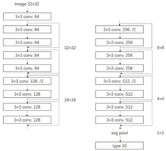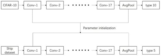 In order to use a sufficient number of training samples, we adopt the method of transfer training. Transfer learning is a deep learning technique that is very suitable for small amounts of data. The principle is to use the existing dataset to train the proposed model, and then make it suitable for our problem through simple adjustments. We used a pre-training ResNet model and a CIFAR-10 dataset to achieve the transfer learning training [], and then fine-tune the trained parameters as initialization parameters, making this model suitable for our ship recognition method, as shown in Figure 6.