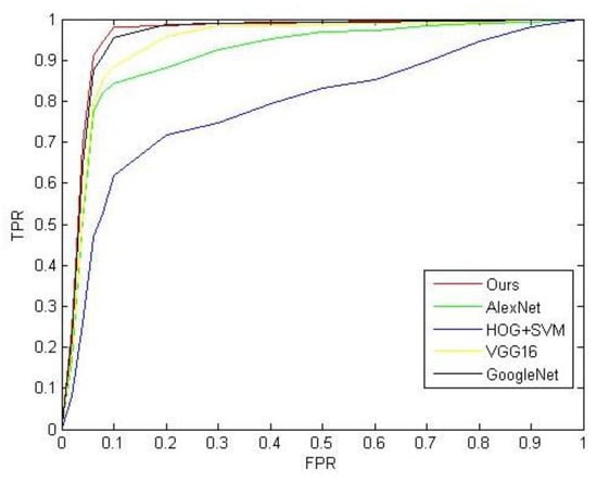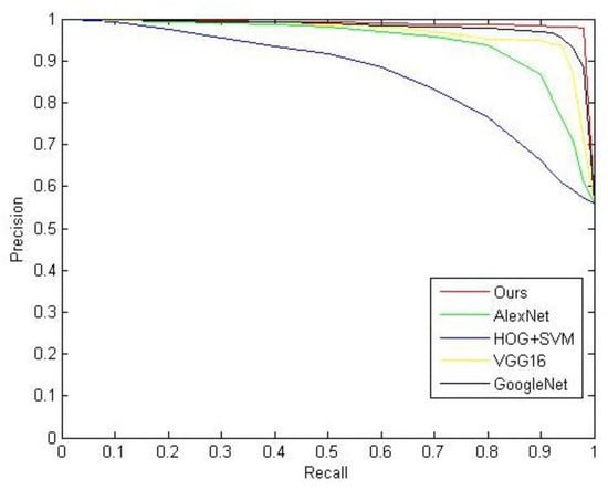 When the ResNet model training was completed, we performed unsupervised recognition on the proposed model and compared it with the recognition results of the HOG+SVM [,], AlexNet, GoogleNet and VGG16. We selected a total of 1210 images, including 250 sea surface images, 250 land images, 280 cargo ship images, 280 steamer images and 150 warship images. We used Receiver Operating Characteristic (ROC) curve and PR curve to evaluate the experiment results. Unlike the saliency detection experiment, we needed to redefine the horizontal and vertical coordinates of the curve.