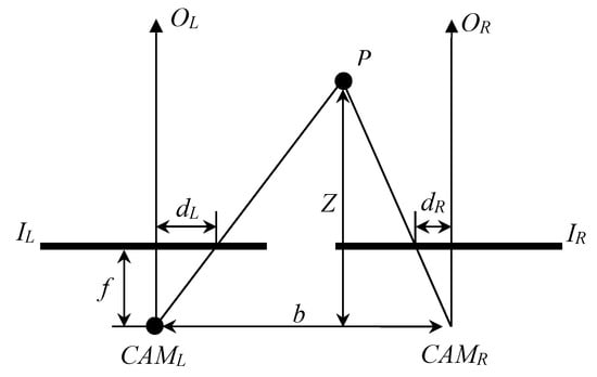 The disparity is denoted as dL + dR, and it is the amount of horizontal displacement that is produced by the same object that is imaged by two cameras. Since both f and b are known, it can be seen that it is quite important to obtain the disparity in the stereo vision system. The key to obtaining the disparity is matching the same object in the two images [,].