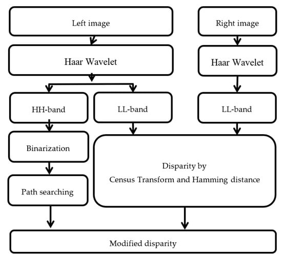 In this section, the multi-resolution of the image with a Haar wavelet is used to reduce the computational time of the census transform (CT) and Hamming distance operations. The flow of this method is shown in Figure 2. First, the left and right view images are input. For both images, Haar wavelets are performed to obtain the frequency domain data of LL, HL, LH, and HH-bands. The outputs of LL-bands are converted by CT and the disparity calculated using the Hamming distance. The output of the HH-band from the left image is performed by path searching after binarization. The stop point of the path searching is determined by the high values in the HH-band. The disparity is modified to find the largest disparity that appears in the search paths.