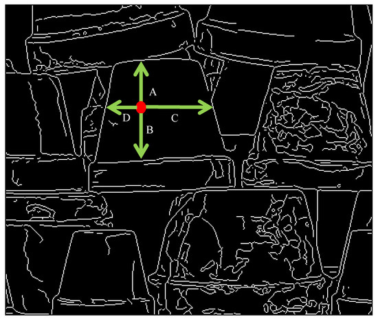 Since the size of the LL-band is smaller than the original image, one main idea of this method is to use the LL-bands of original images to reduce the computational load of CT. Moreover, since the down-sampled image may result in errors, another main idea is to use the HH-band of one original image to modify the disparity. The path searches of the pixel in the HH-band are in four directions: up, down, right, and left. An example of an HH-band image is shown in Figure 3 and a point is colored in red. Since the mechanical stereo vision is applied by two horizontal cameras, the horizontal direction is the main searching path. In order to reduce the effect of large areas without borders, the vertical direction is added to the searching paths. The four searching paths are from the red point to four directions, which are denoted as A, B, C, and D with green arrows. Each searching path is stopped when the path arrives at the edge (white point). The corresponding disparity values (the output of CT with Hamming distance) on the paths are recorded and counted. The modified disparity is set as the disparity value with the largest number.