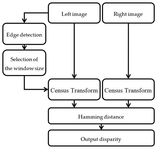 The flow chart of AWCT is shown in Figure 4. First, the edge information can be obtained from the left view image by edge detection. The conversion window size of each point can be determined by the edge information. The selected window sizes are applied for CT, and the disparity can be computed through a Hamming distance computation.