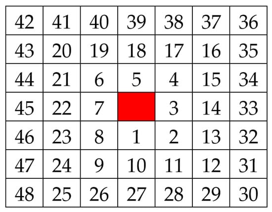 Since the conversion window size is adaptive, the used window size of each pixel may be different. The smaller windows size is selected to compute the hamming distance when the sizes are different. In order to make the comparison of hamming distance reasonable, the calculation order of pixels is counter-clockwise from the center outward. An example of the pixels’ order is shown in Figure 5. Even if the two windows are different in size, this order will make the relative positions of the pixels the same. The comparison of Hamming distance is up to the length of the small window. This allows the hamming distance to be used in the same window size.